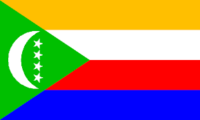 | Komor Bayrağının Şekli: Zemin sarı (en üstte), beyaz, kırmızı ve mavi olmaz üzere dört eşit yatay şeridin üzerine tabanı gönder kısmında olan yeşil bir eşkenar üçgenden ibarettir. Yeşil eşkenar üçgenin içerisinde arkası gönder tarafında kalan beyaz bir hilal ile hilalin ağzının önüne yukarıdan aşağıya dizilmiş dört adet beyaz beş köşeli yıldız bulunmaktadır. Bu dört yıldız Komor'u oluşturan dört adayı temsil etmektedir. Beyaz hilal ve yeşil renk ise İslamiyet'in simgeleridir. | ||||||||||||||||||